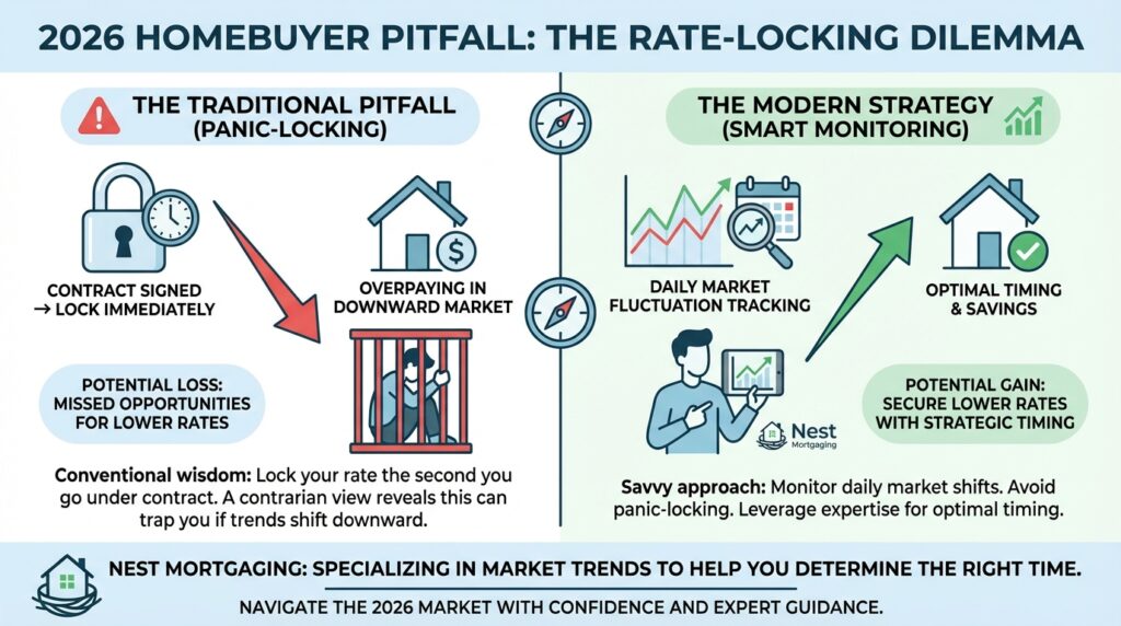 Another major pitfall for 2026 homebuyers is the traditional approach to rate locking. Conventional wisdom dictates that you should lock your interest rate the second you go under contract. However, taking a contrarian view reveals that blind rate locking can actually trap you into overpaying if market trends are shifting downward.